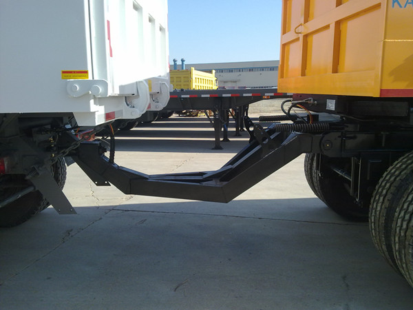 This dump truck with full trailer can load more goods.The load of the trailer is fully borne by itself, and it is connected with the locomotive only by hooks. It only provides power to help the trailer overcome the frictional resistance of the road. It is mainly used for transportation in docks, factories, ports and other fields.